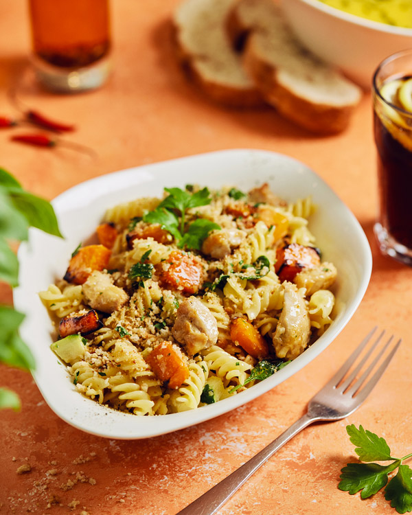 ?Fusilli e pollo: Pollo, calabaza horneada, cebolla blanca, chili, ajo, nata, mozzarella, grana padano, espinacas, picatostes y perejil fresco picado y romero.
