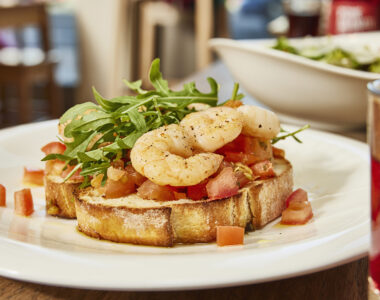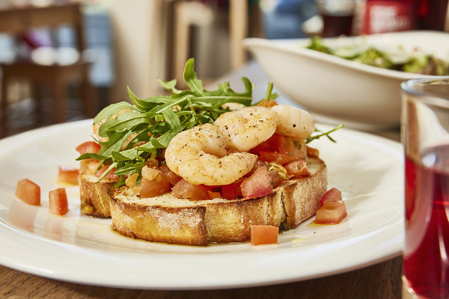 Ciabatta tostada con tomates picados, ajo y albahaca, cubierta con langostinos a la parrilla.