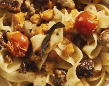Salchicha italiana con girgolas y champiñones, salvia, tomate y nata. Coronada con queso, aceite de ajo y crujiente de salvia.