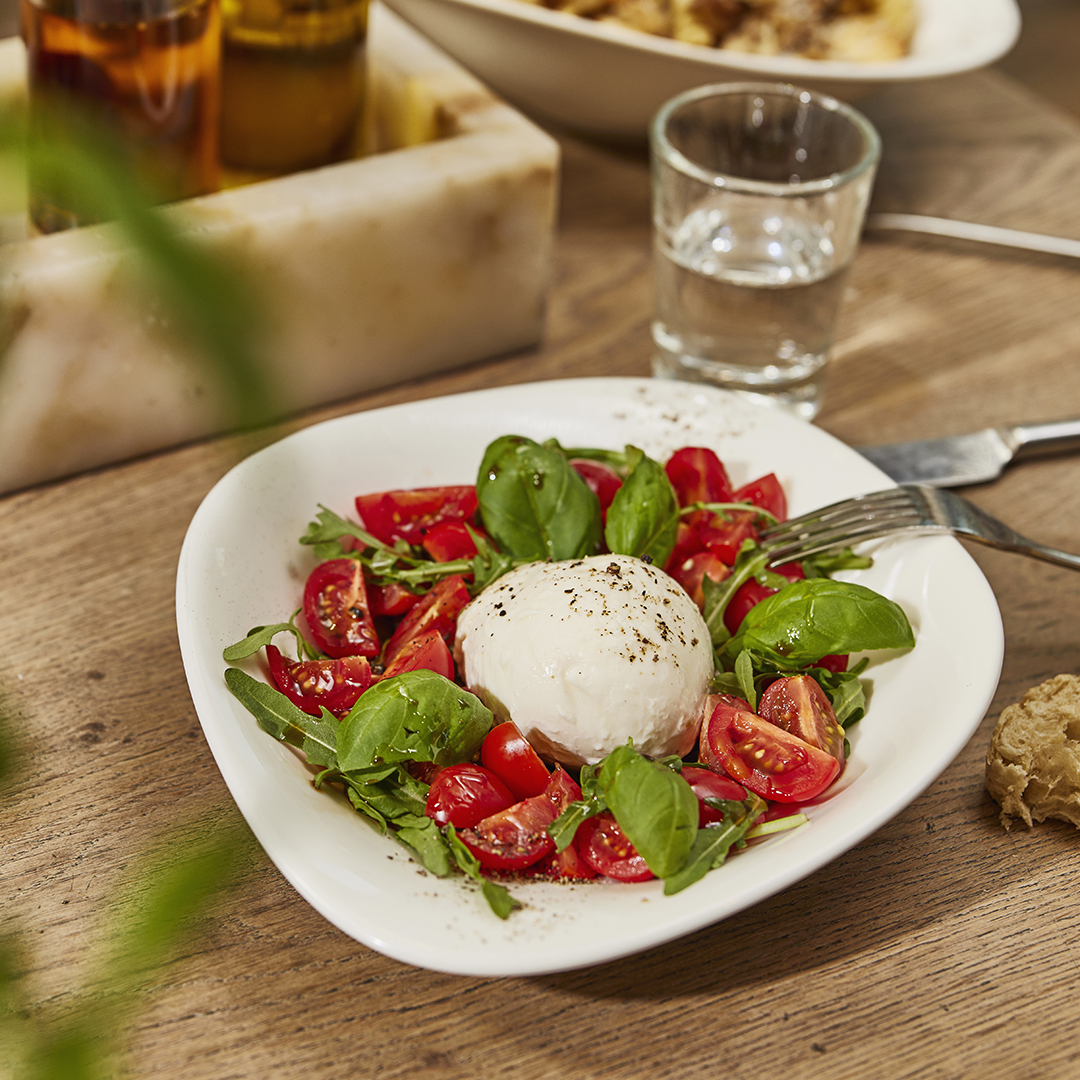 Bola entera de mozzarella de búfalo, tomates cherry y albahaca fresca.