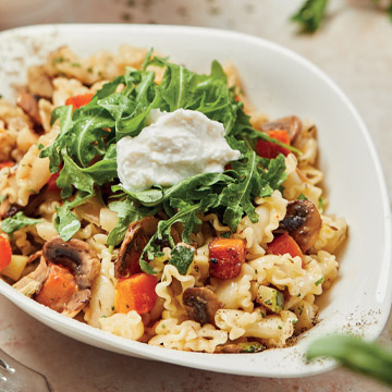 Nuestra salsa casera de ajo, limón y perejil con cebolla pochada, calabacín, champiñones y calabaza asada, acabado con hojas frescas de rúcula y queso ricotta.