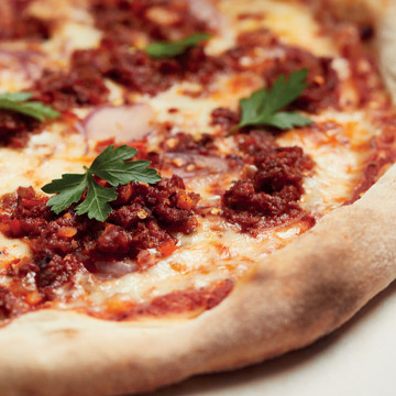Nuestra masa de pizza casera con salsa de tomate, mozzarella, la clásica boloñesa, cebolla roja y chili flakes.