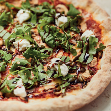 Nuestra masa de pizza casera con salsa de tomate, mozzarella, champiñones, pipas de calabaza tostadas, rúcula, queso ricotta y un toque de aceite balsámico de trufa.