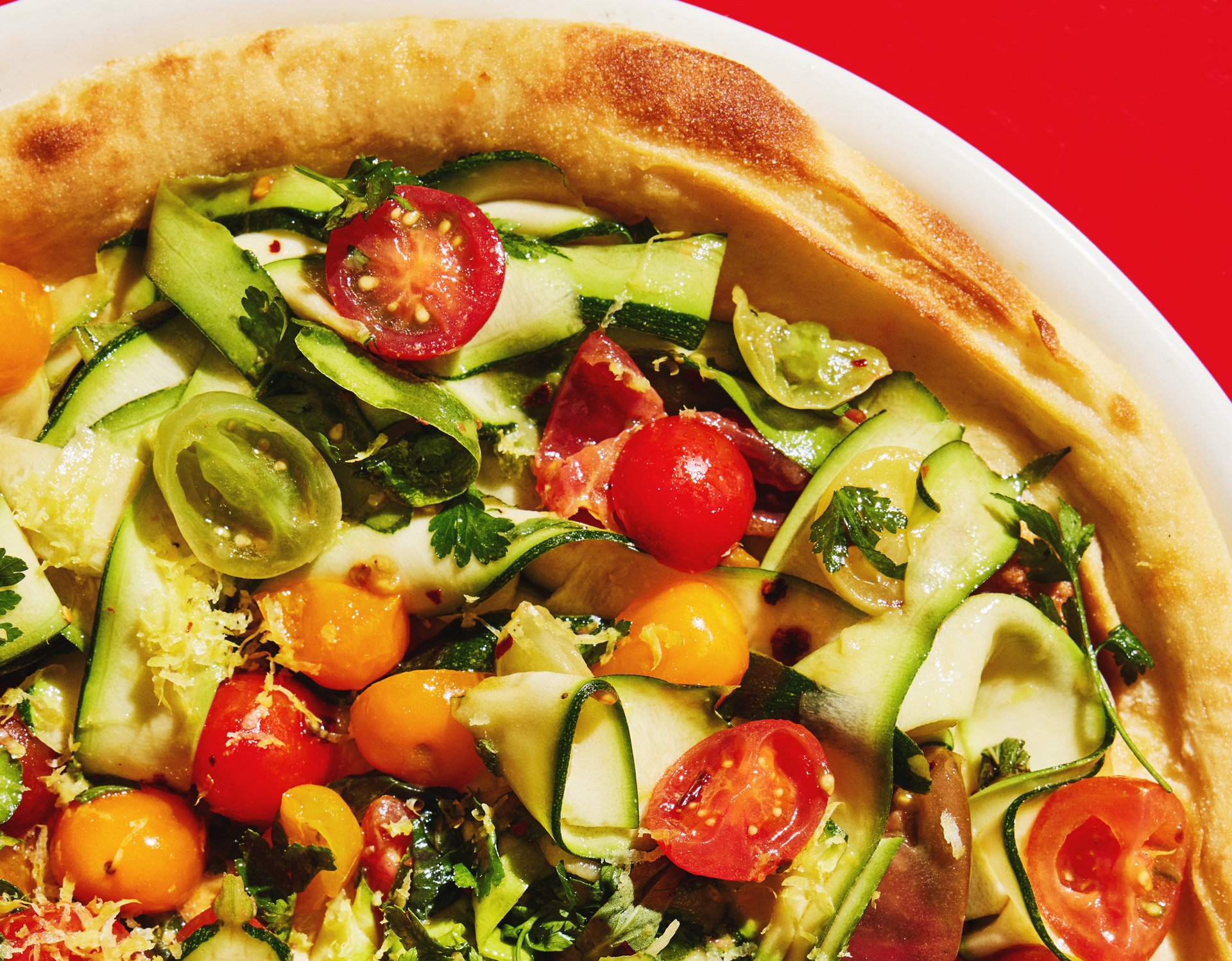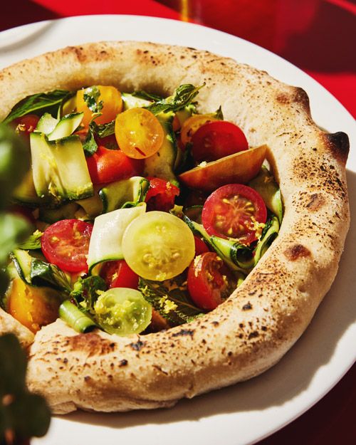 La pizza perfecta para los amantes de la frescura. Con una base de tomates Heritage, tiras de calabacín, menta, perejil y albahaca, sazonada con chili flakes y una ralladura de limón, todo coronado con un generoso chorro de aceite de ajo. Una mezcla que redefine la simplicidad y la elegancia de los sabores mediterráneos.